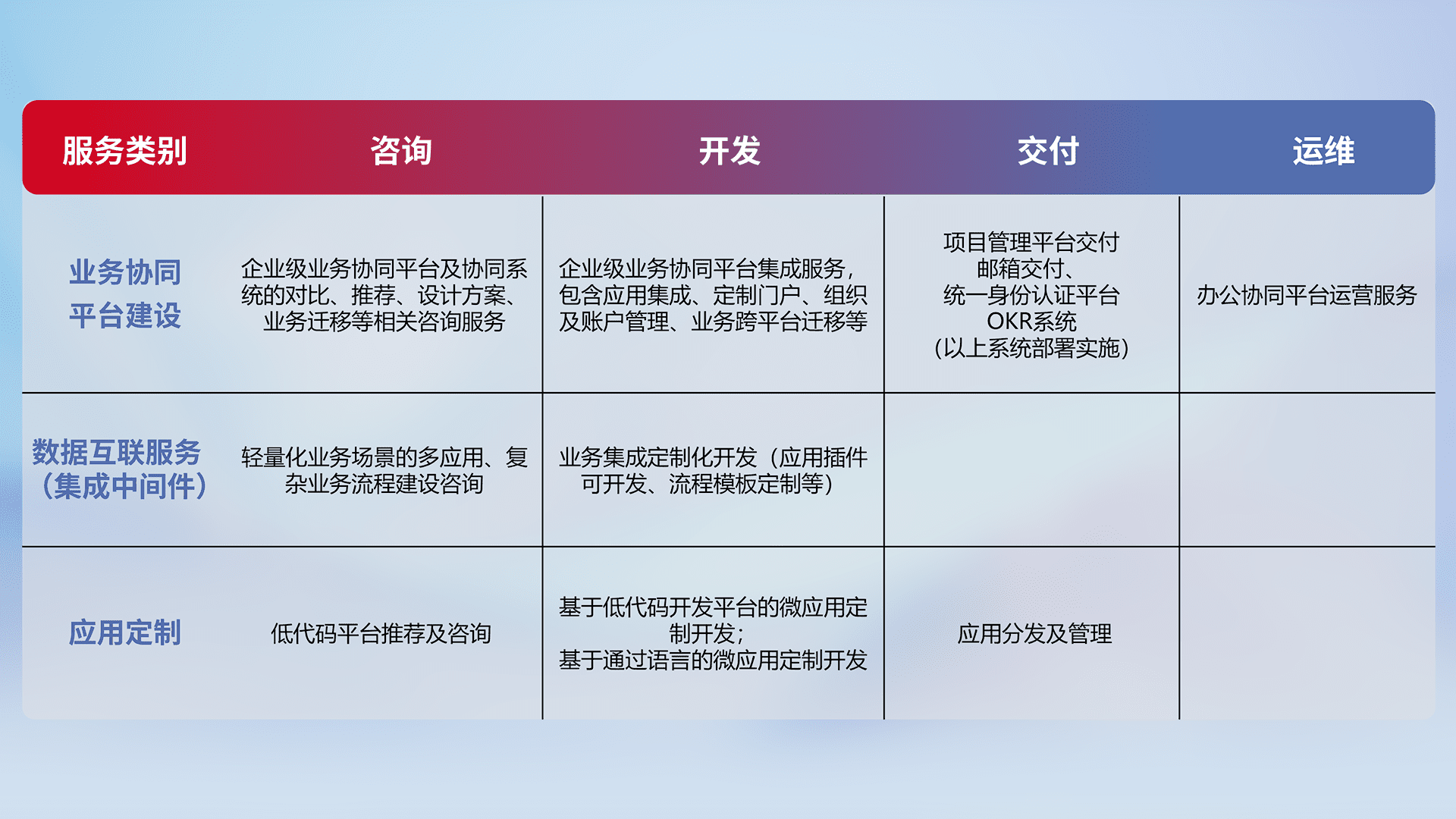 针对钉钉、、、、企微、、、、IDaas等平台级产品提供产品的规划、、、方案、、交付、、定制化开发等服务,,,实现如统一协同办公、、、智能客户服务、、、、混合会议管理、、、智能数据查询、、、、等业务场景,,,实现数字化转型。。。。
